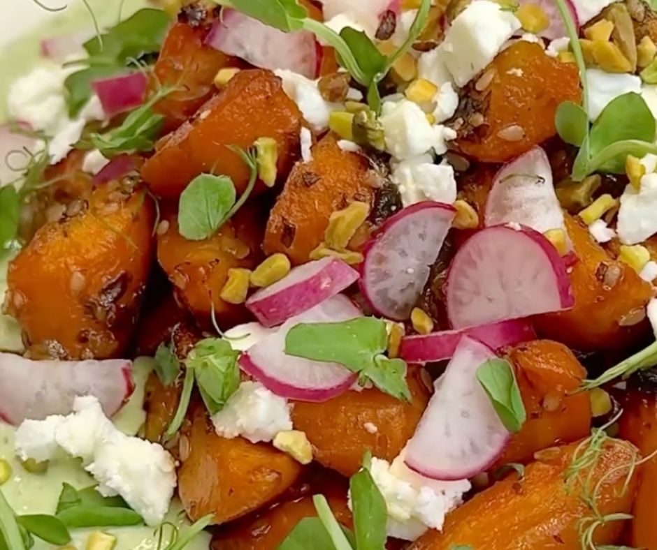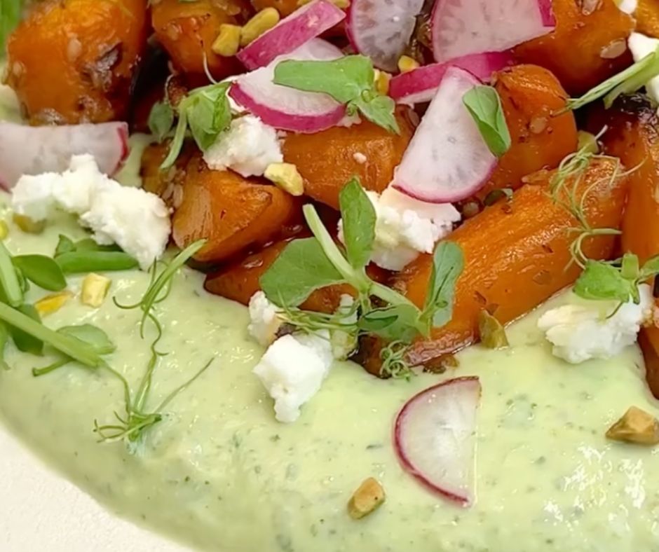Spoon the creamy ricotta-feta sauce onto a serving plate. Top with the hot roasted carrots. Garnish with extra herbs, chopped pistachios, and a sprinkle of sesame seeds if desired.