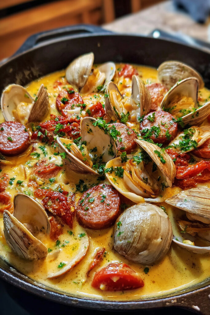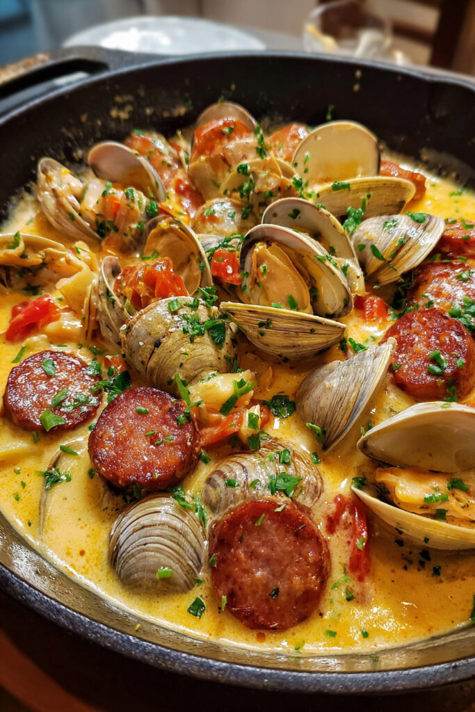 🥘 Clams and Chorizo Sausage in a Cream Sauce – A Flavor-Packed One-Pot Dish
