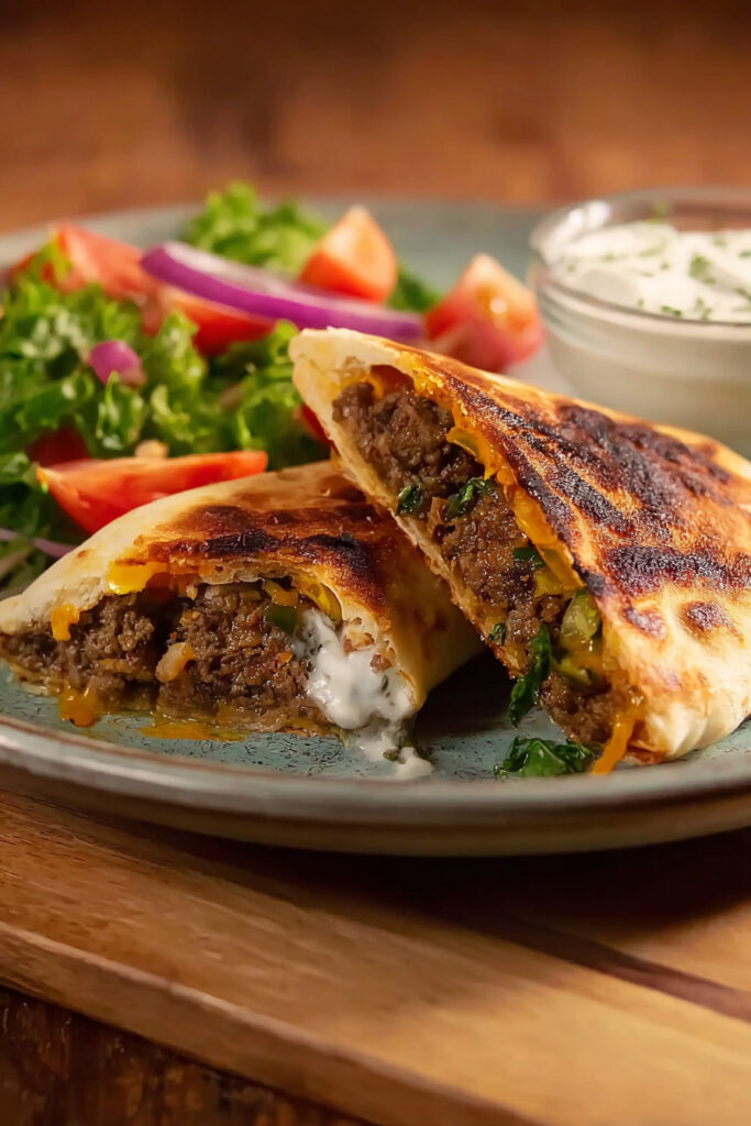 Cut your pita breads into halves (or quarters for smaller, appetizer-sized pieces). Carefully open each pocket and spoon in the beef mixture. Press it flat so the filling spreads evenly inside—this ensures even cooking.