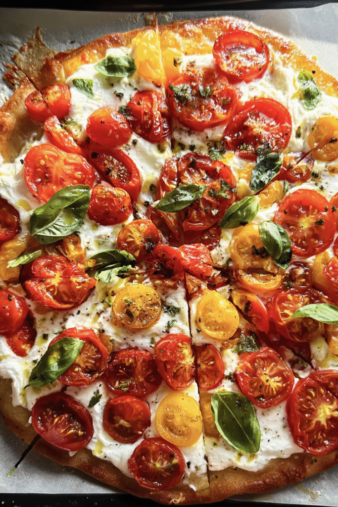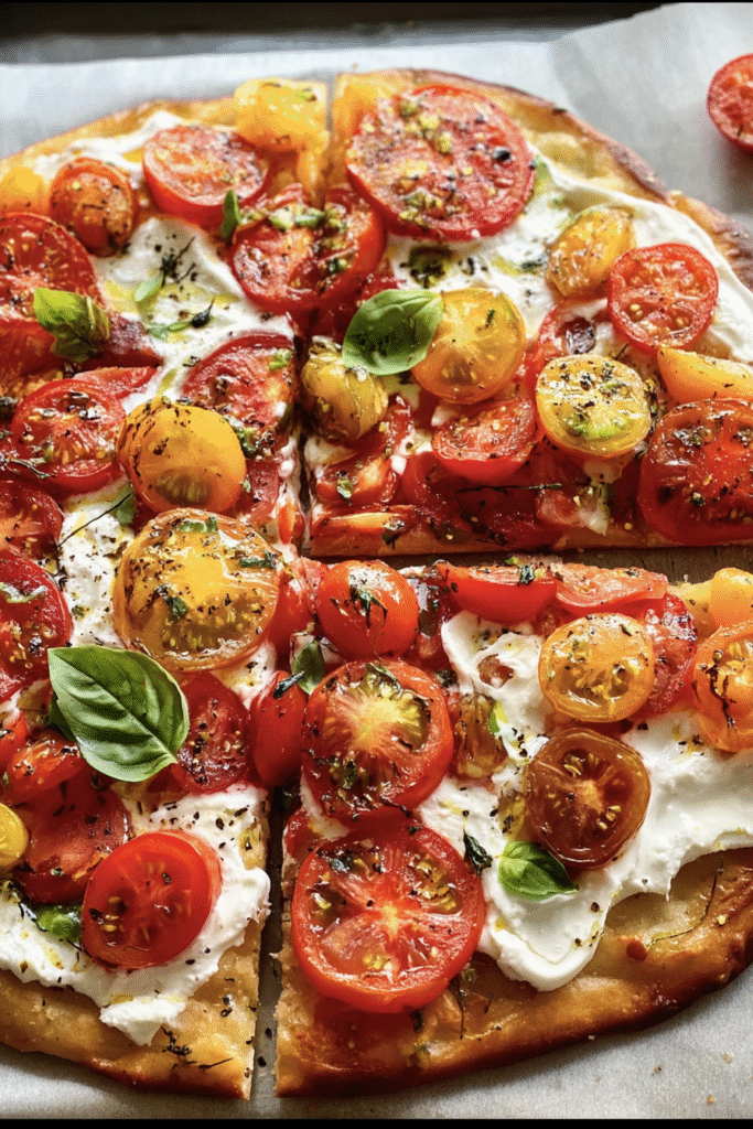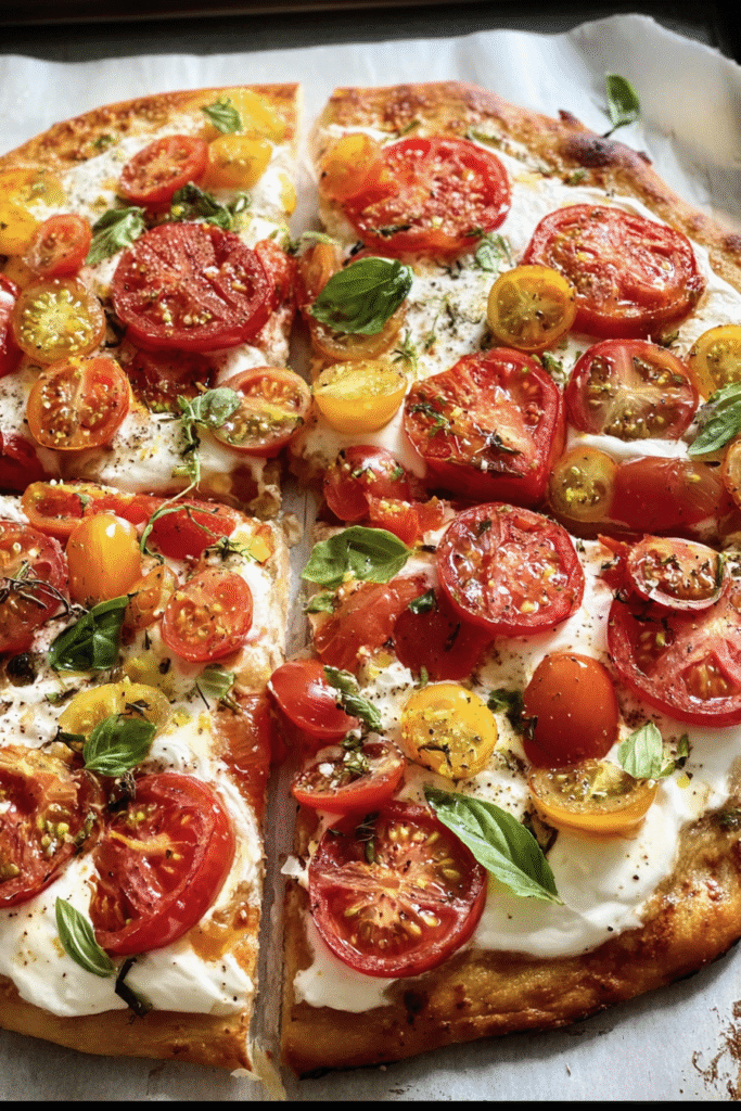 When summer’s calling with a bounty of ripe tomatoes, the Big Little Summer Tomato Pizza answers in the most delicious way possible. Imagine a pie topped with a vibrant, stained-glass array of juicy tomatoes, tangy crème fraîche, warmly sweet onions, and creamy burrata all finished with fragrant fresh herbs. Ready in just 40 minutes, this pizza is as easy as it is beautiful—perfect for sharing, snacking, or serving as a light dinner.