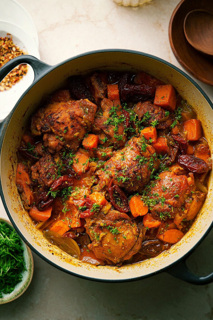 This Braised Chicken Thighs With Sweet Potatoes and Dates recipe is comfort food at its finest — hearty, flavorful, and beautifully balanced between sweet and savory. The combination of tender chicken, caramelized sweet potatoes, and luscious dates creates a dish that’s both cozy and exotic.