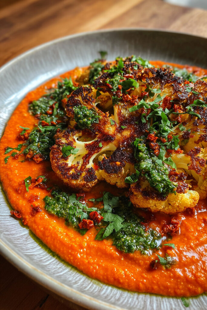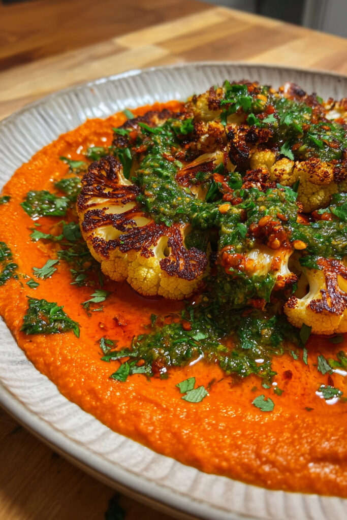 What makes this recipe special is the layering of flavors: the natural nuttiness of cauliflower, the smoky sweetness of roasted peppers, and the herby, garlicky punch of chimichurri. It feels restaurant-worthy but is surprisingly easy to whip up at home.