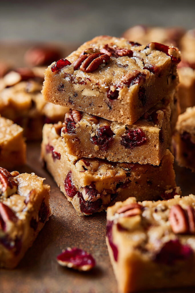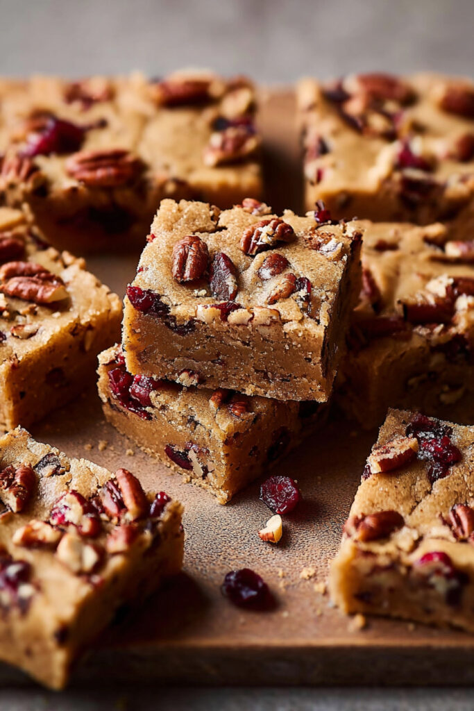 Imagine a soft, buttery cookie base studded with tart cranberries, crunchy toasted pecans, and a hint of vanilla. Each bite is perfectly balanced—sweet, slightly tangy, and nutty. These bars are like a cozy winter sweater for your taste buds.