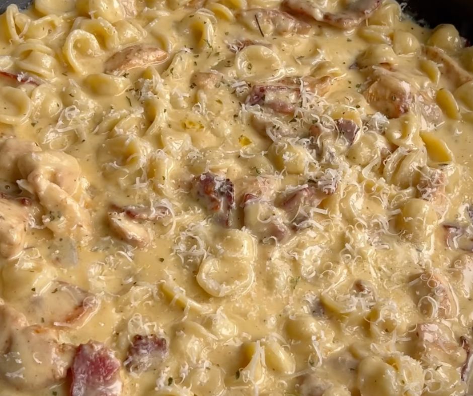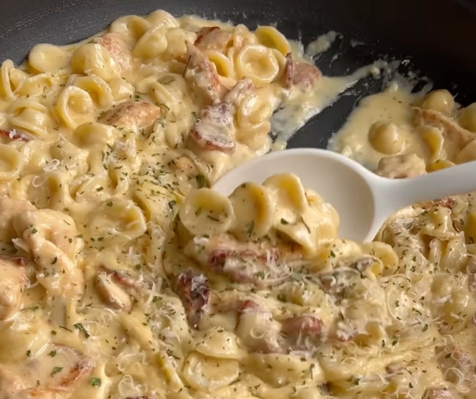 Time to party! Add your drained orecchiette, reserved pasta water (just enough to loosen the sauce), cooked chicken, and bacon into the pan. Mix it all together and let everything cook for 2–3 minutes so the sauce really clings to the pasta.