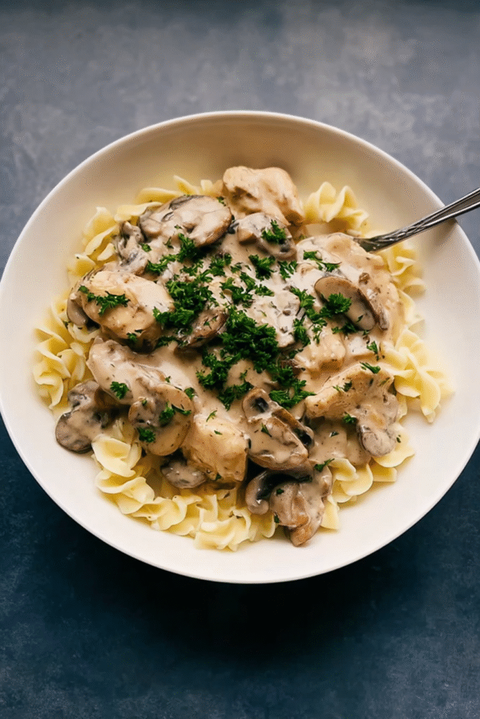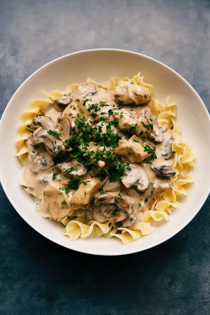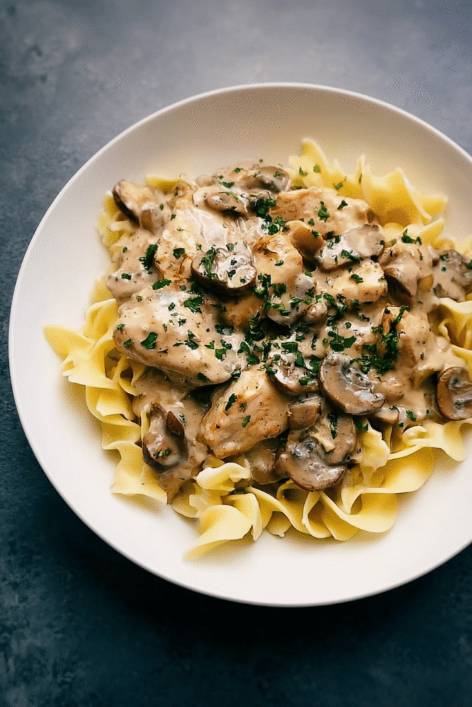 - Plate the stroganoff over a bed of egg noodles and garnish with fresh parsley if desired.