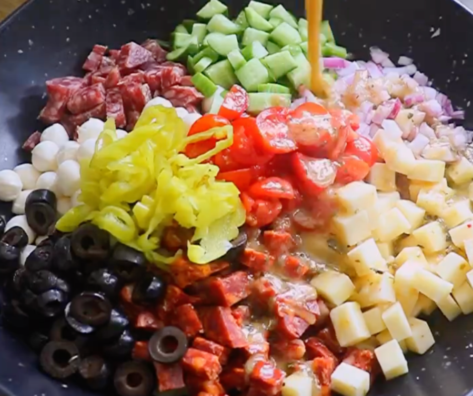 In a large bowl, add the pasta, veggies, meats, cheese, and herbs. Pour the dressing on top and mix thoroughly to coat every piece.