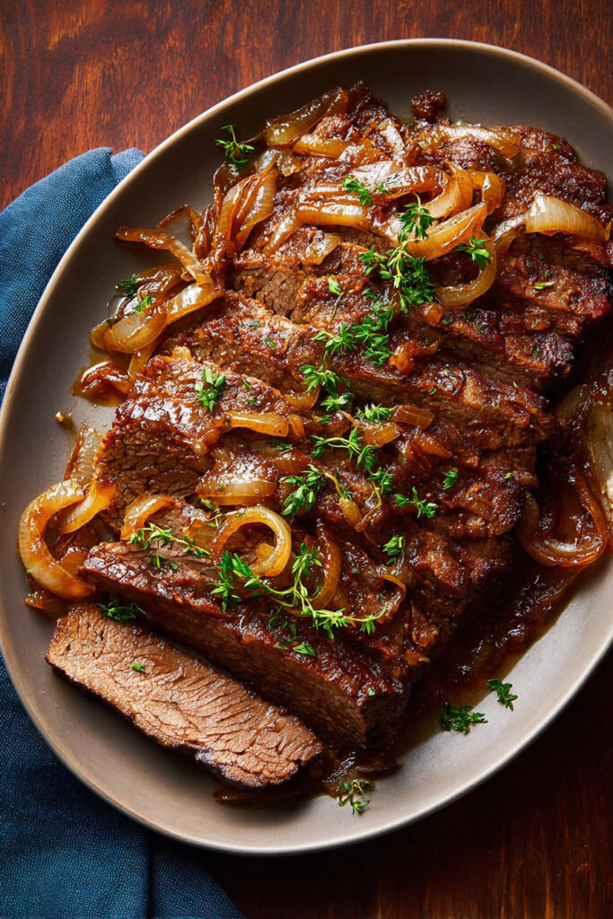 - For a rustic presentation, pile the brisket slices onto a platter, spoon the onions over the top, and garnish with fresh herbs.