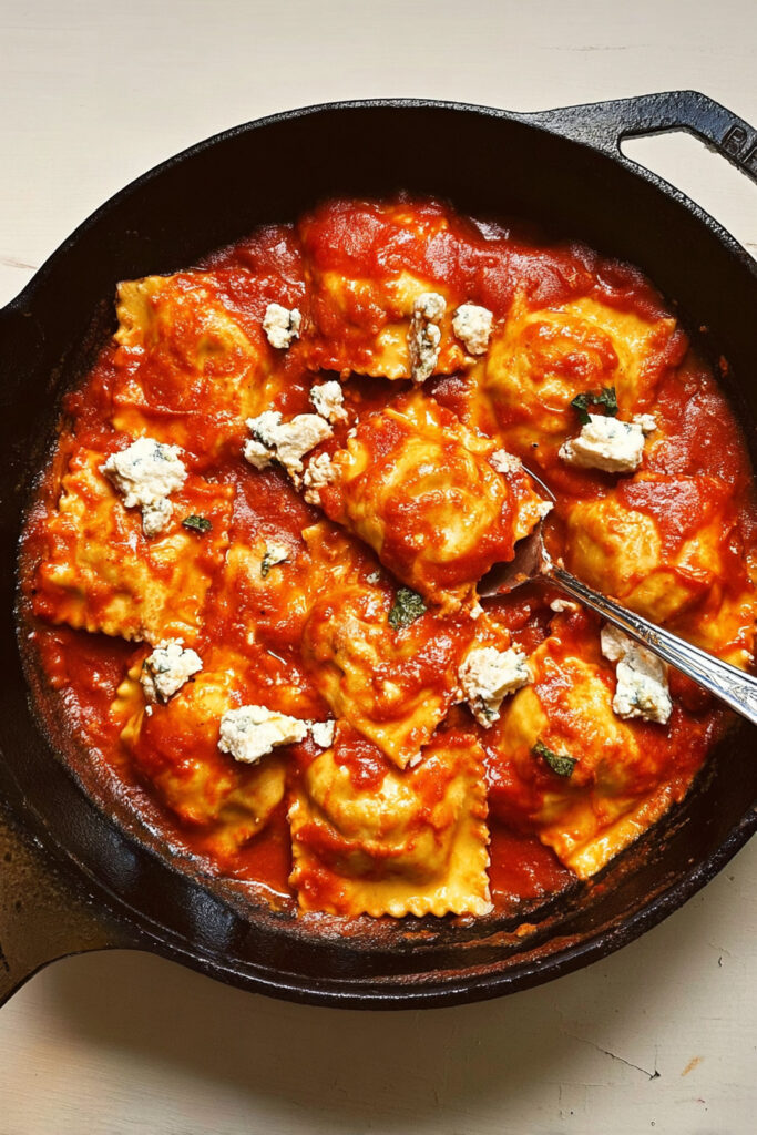Add the cooked ravioli directly into the sauce, tossing gently to coat each piece evenly. Allow everything to simmer together for 1–2 minutes so the ravioli absorbs some of that incredible flavor.