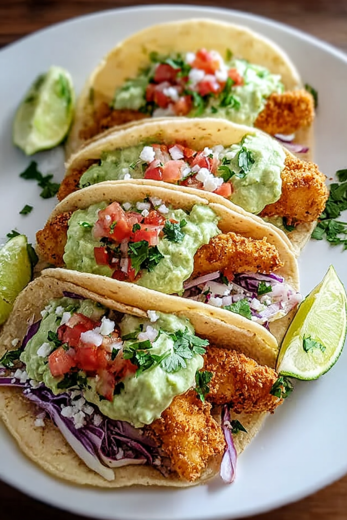 Modern versions, like these Crispy Baja Fish Tacos with Avocado Crema, elevate the flavor even more by pairing the crunchy battered fish with a cool, velvety avocado crema that adds freshness and a pop of richness.
