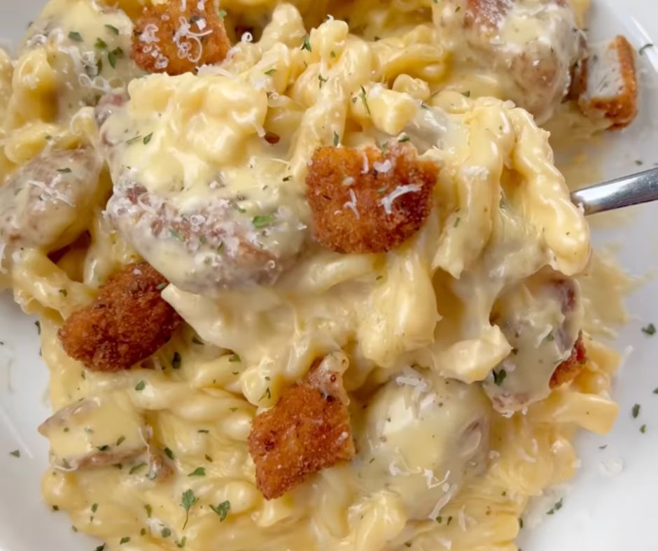 Between the crunchy chicken, the creamy cheese sauce, and the tender pasta, every bite is pure, cheesy bliss. 🧀💛