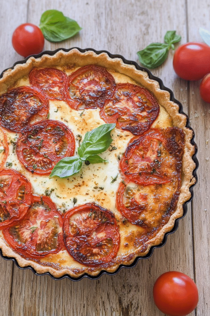 - Bake for 35–40 minutes, until the crust is golden, cheese melted, and tomatoes soft but not soggy.