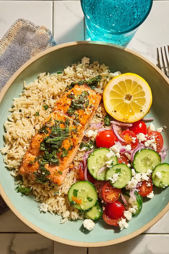 The Lemony Salmon Rice Bowl with Feta, Cucumber & Tomato Salad is more than just a recipe—it’s a celebration of fresh, nourishing ingredients that come together in harmony. With flaky salmon, zesty lemon, fluffy rice, and a vibrant Mediterranean salad, this dish delivers everything you want in a healthy dinner: flavor, balance, and satisfaction.