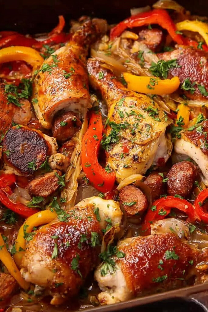 Nestle the chicken and sausage back into the pan. Cover and simmer over medium-low heat for 25–30 minutes, until chicken is fully cooked and tender.