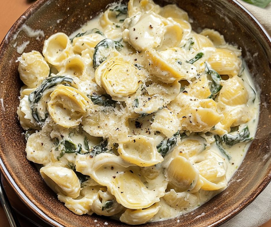This dish is all about emulsion. The combination of cheese, cream, and pasta water creates a thick, glossy sauce that clings to every bite. The artichokes add a slight tang, while the spinach gives you those “hey-I’m-being-healthy” vibes. It’s rich but balanced—thanks to the acidity and a touch of spice.