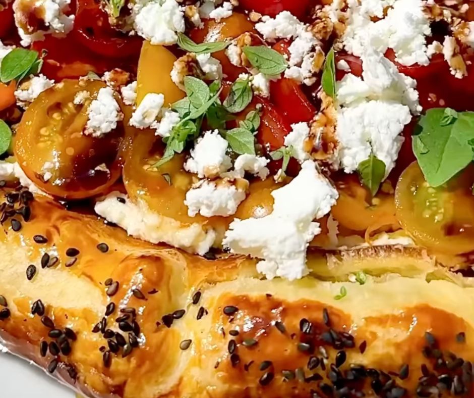 If you’re craving a flaky tart with a golden, cheesy crust and a creamy, tangy filling that screams “Eat me!”—this is it. This French-inspired savory tart is bursting with juicy roasted cherry tomatoes, a whipped feta cream that’s kissed with honey and lemon zest, and a crust that’s loaded with mozzarella and sprinkled with sesame seeds. It’s everything you want in a summer lunch, picnic star, or dinner party appetizer.