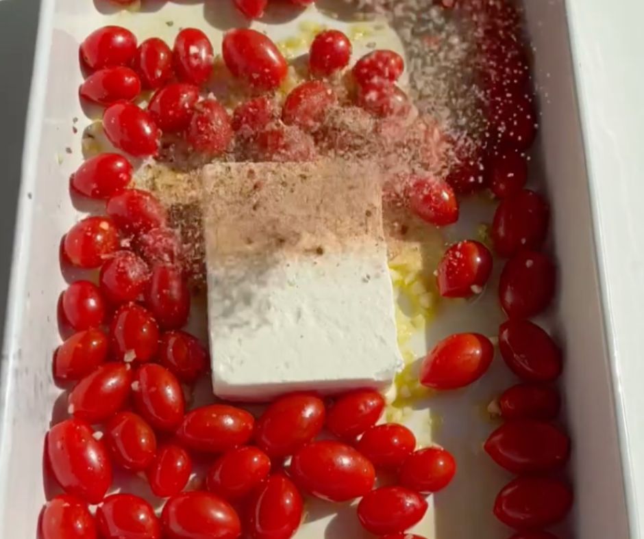 Set your oven to 400°F (200°C). In a baking dish, add cherry tomatoes and minced garlic, then drizzle with olive oil. Place the block of feta in the center of the dish and give it a good drizzle too.