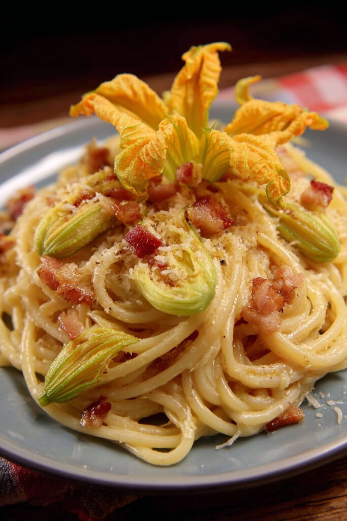 If you’ve never cooked with zucchini flowers before, this is the perfect recipe to start. They transform a classic carbonara into something memorable, elegant, and full of sunshine.